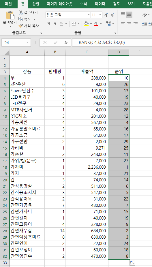 - 우리가 순위를 구하고자 입력하고 있는 셀은 D4셀 입니다. 4행에 있는 '무'의 매출액은 C4셀에 288,000원으로